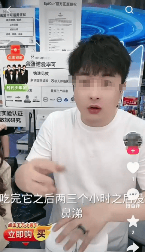 不仅如此,辛巴在直播过程中还多次巧妙地暗示了该产品的神奇功效:“鼻炎、总流鼻涕?吃完两三个小时,鼻涕就没了。”