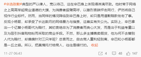 此外,还有网友认为,当初辛巴“高高举起商业道德的大旗,为消费者振臂高呼,以激烈言辞抨击同行,俨然将自己视作行业标杆。然而,当同样的情况降临到辛巴身上时,却只是用道歉赔款匆匆了事。”