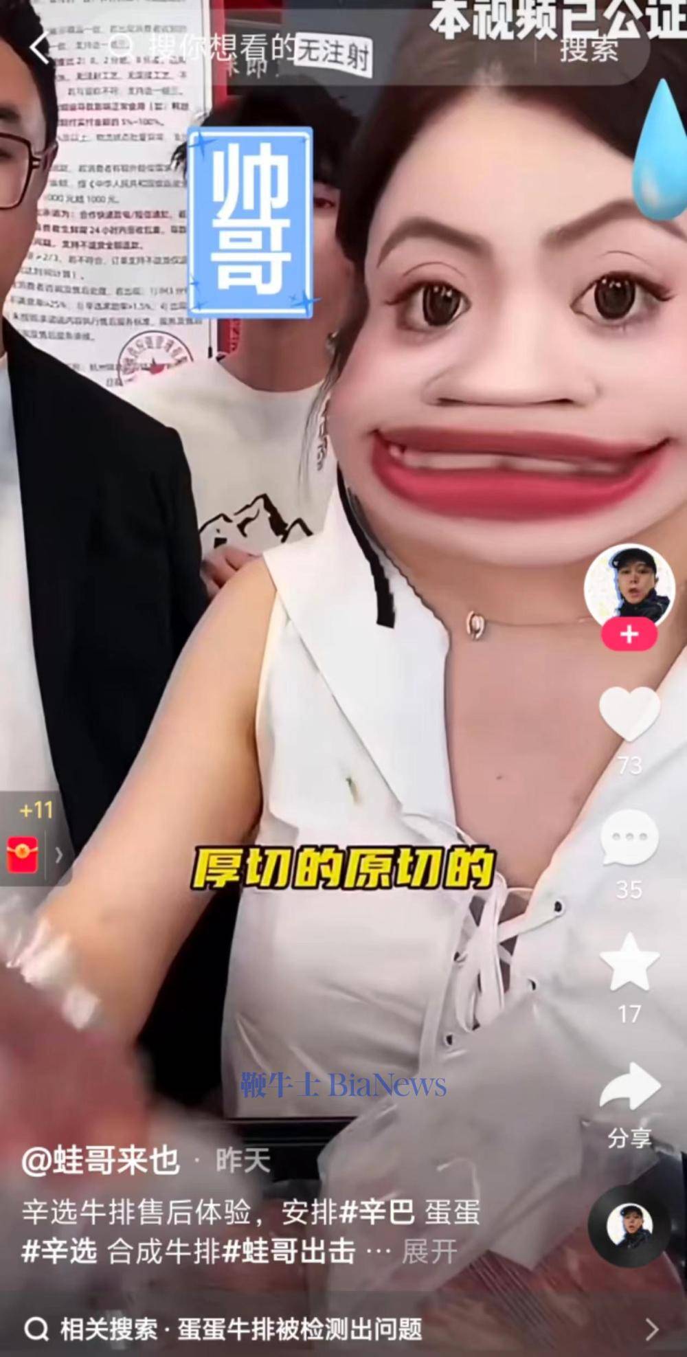 打假博主“蛙哥出击”昨日发视频称,辛选主播蛋蛋在直播间推荐的一款牛排涉嫌产品标签虚假标注。该打假播主称蛋蛋涉嫌“误导性宣传”,蛋蛋在直播中多次称牛排为原切肉类产品,但实为调理产品。