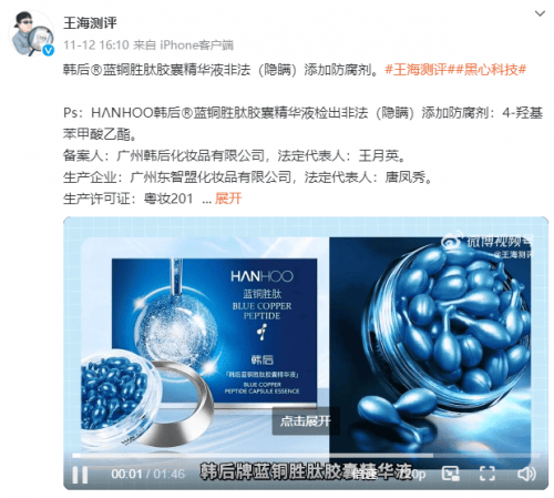 早在上月12号,王海就通过平台揭露了韩后品牌的一款蓝铜胜肽胶囊精华液涉嫌违规使用4-羟基苯甲酸乙酯作为防腐剂的问题。王海强调,韩后这两款产品在成分列表中故意遗漏了这些防腐剂的信息,这种行为不仅违反了《化妆品标签管理办法》和《化妆品监督管理条例》,更是对消费者知情权和健康权益的侵犯。
