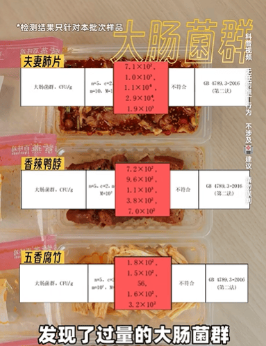 具体来看,紫燕百味鸡“夫妻肺片”“香辣鸭脖”两款产品菌落总数超标;“夫妻肺片”“香辣鸭脖”和“五香腐竹”3款产品中发现过量大肠菌群,其中“夫妻肺片”“香辣鸭脖”两款产品送检的5个样品全部超出了大肠菌群最高安全限量,最为严重的是“夫妻肺片”一个送检样品,其大肠菌群超标达290倍。