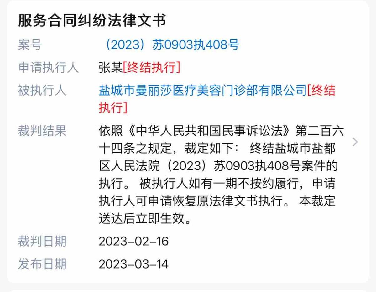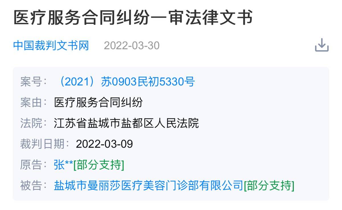 最终,法院判令被告盐城市曼丽莎医疗美容门诊部有限公司退还原告张**39800元,并赔偿原告张**119400元,合计159200元,于本判决生效(2022年3月9日)后十日内履行完毕。