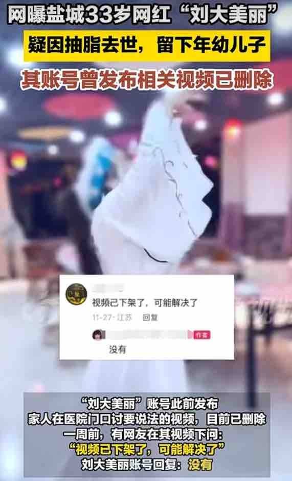 另一位接近“刘大美丽”的知情人士向极目新闻记者透露,11月26日上午大约9点50分,“刘大美丽”进入盐城曼丽莎整形医院进行脂肪抽取手术,当天下午大约2点50分去世。目前,当地卫生健康委员会、检察院和警方均已介入调查。12月9日下午,盐城派出所的工作人员向极目新闻记者表示,他们在接到报警后已经出警处理。