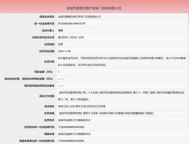 2020年4月19日,盐城市曼丽莎医疗美容门诊部有限公司因违反了《医疗纠纷预防和处理条例》第十五条第一款、《病历书写基本规范》第三条、第八条第一款,被盐城市卫生健康委员会处以警告并罚款10000元的行政处罚。
