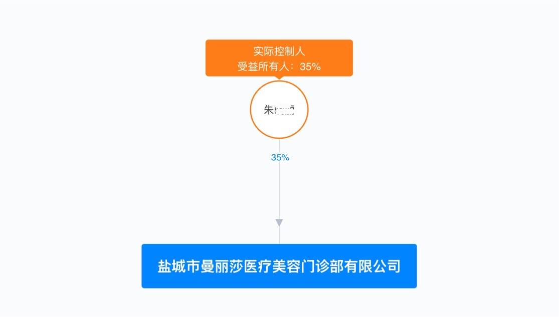 天眼查显示,盐城市曼丽莎医疗美容门诊部有限公司,成立于2017年,位于江苏省盐城市,企业注册资本100万人民币。法定代表人曹某,但是曹某却不占有大比例股权,实际控制人为朱某某,占有35%股权。