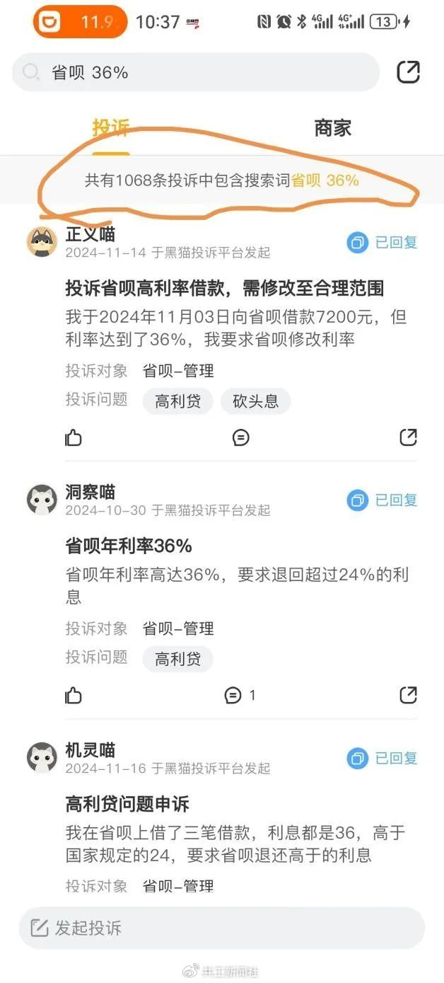 与李某一样遭遇省呗高利率收割的用户不在少数。在黑猫投诉上,目前有关省呗贷款利率高达36%的投诉量,已经多达千余条。其中,一位来自黑龙江的省呗用户,名下6笔借款共计63400元利息高达36%;另一位来自陕西的省呗用户,名下23000元借款利息高达36%,因断供遭遇对方骚扰和言辞威胁……