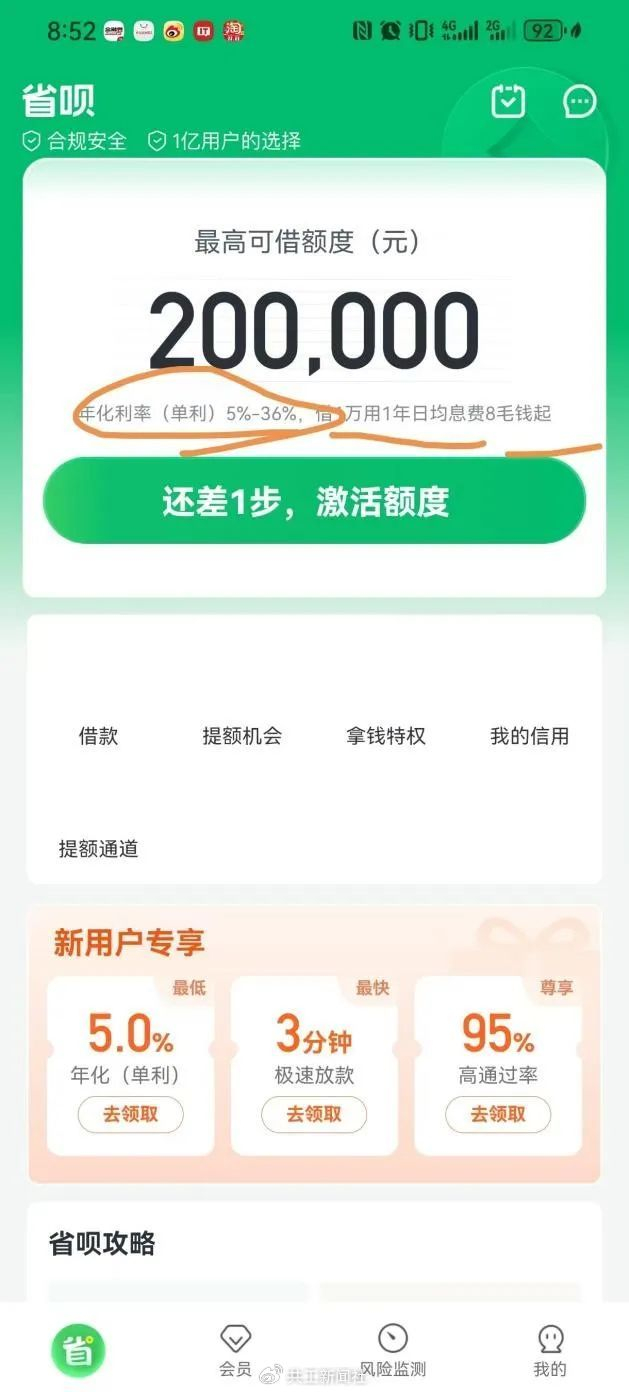 新浪科技实测发现,在省呗App上,目前平台明确标出了年化利率(单率)5%~36%的字样,但当用户注册并激活额度后,最低年化利率则变成了7.2%,且用户首次借款时,平台会强制要求借出平台审核通过的所有额度——年化利率高达20%以上。