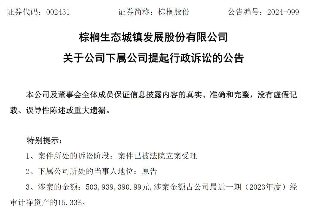 11月4日晚间,棕榈股份(SZ002431)公告称,下属公司海口棕美项目建设投资有限公司(以下简称海口棕美)作为原告起诉海口市人民政府,涉案金额约5.04亿元,占公司最近一期(2023年度)经审计净资产的15.33%。