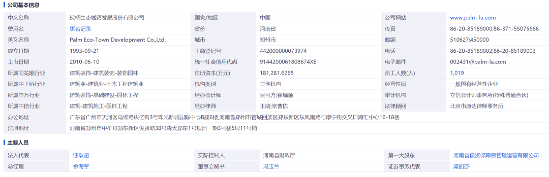 2019年,河南国资中原豫资投资控股集团有限公司成为棕榈股份控股股东,公司注册地迁至河南省郑州市,成为河南省第80家上市公司。目前,公司实际控制人为河南省财政厅。