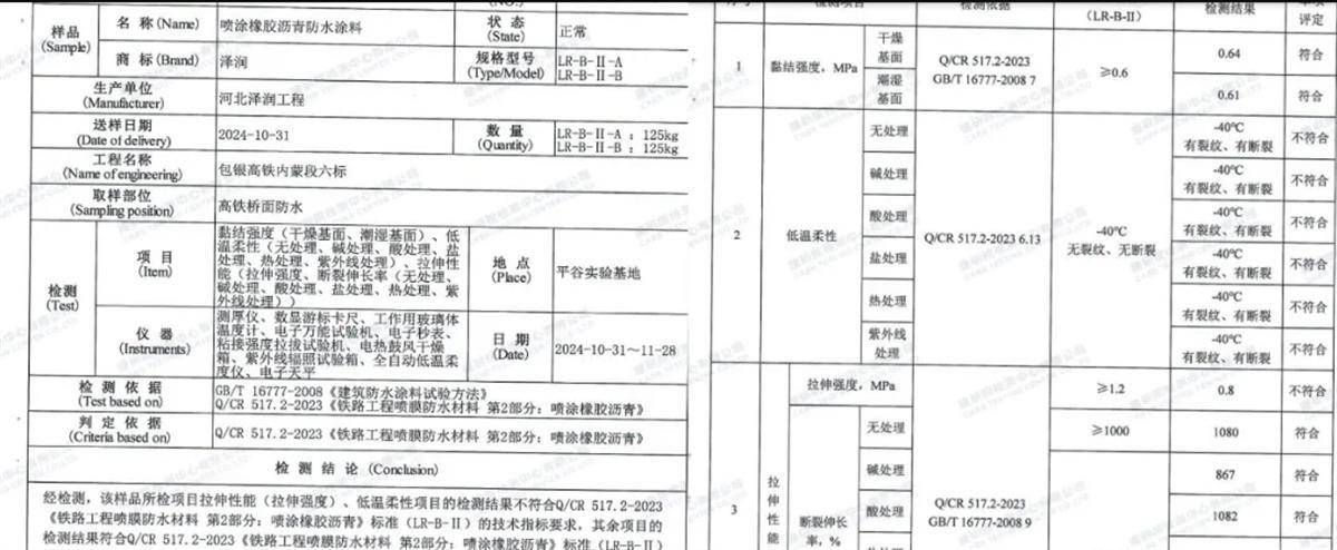 一是,在记者的见证下,举报人在施工现场对喷涂橡胶沥青防水涂料进行了取样。10月31日,样品被送到权威检测机构进行检测。检验结论为样品的拉伸强度和低温柔性检测结果不符合相关技术指标要求。