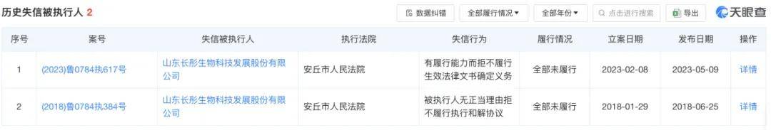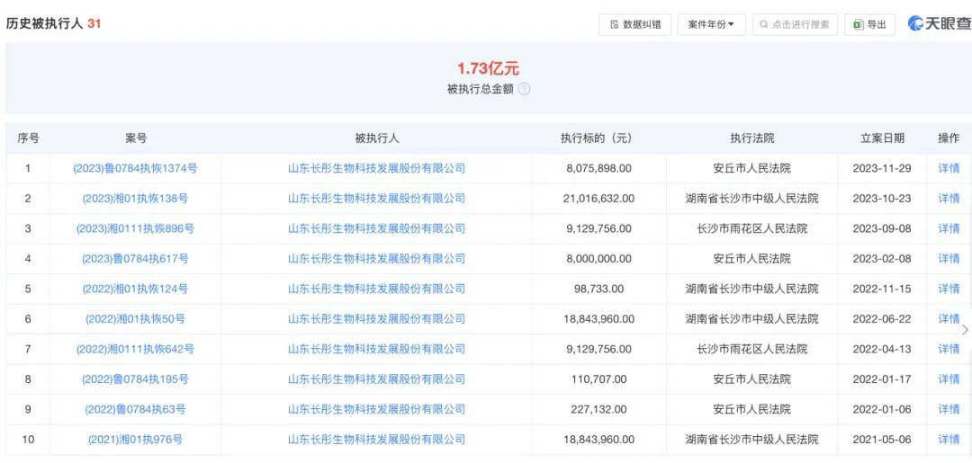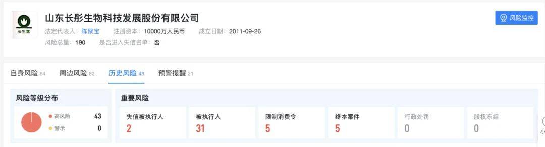 此外,长彤生物还涉及多个诉讼,并且31次成为被执行人。其中,最大的执行标的金额达到2726.1万元,最少的为5188元,累计被执行金额高达1.73亿元,远超企业注册资本1亿元。此外,长彤生物还因有履行能力而拒不履行生效法律文书确定义务而被列为失信被执行人,属于高风险企业。