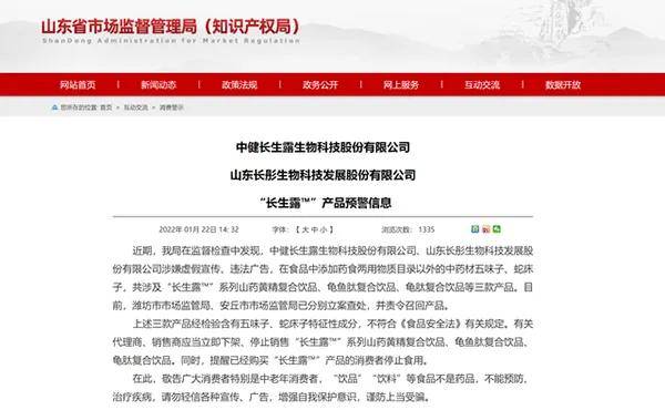 2022年,山东省市场监督管理局(知识产权局)发布消费警示,中健长生露生物科技股份有限公司、山东长彤生物科技发展股份有限公司涉嫌虚假宣传、违法广告,在食品中添加药食两用物质目录以外的中药材五味子、蛇床子,共涉及“长生露”系列山药黄精复合饮品、龟鱼肽复合饮品、龟肽复合饮品等三款产品。潍坊市市场监管局、安丘市市场监管局已分别立案查处,并责令召回产品,并要求有关代理商、销售商应当立即下架、停止销售“长生露”系列山药黄精复合饮品、龟鱼肽复合饮品、龟肽复合饮品。
