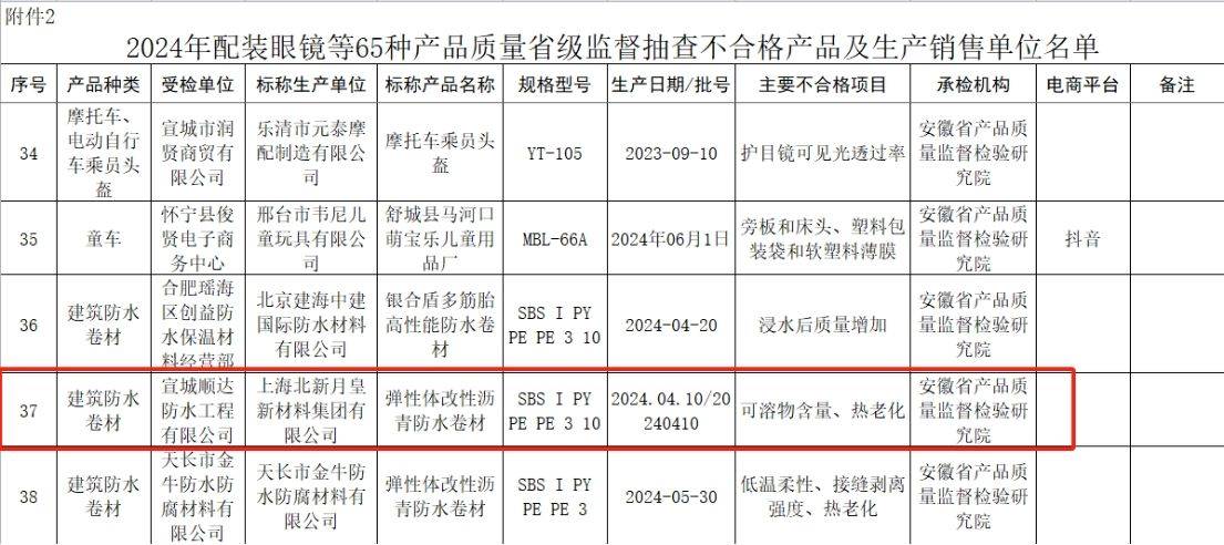 而在此前一天的10月29日,安徽省市场监督管理局发布《关于2024年配装眼镜等65种产品质量省级监督抽查结果的通报》,通报显示,上海北新月皇新材料集团有限公司生产的弹性体改性沥青防水卷材主要不合格项目为可溶物含量、热老化。