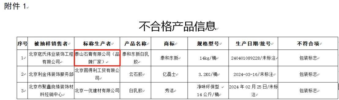 今年8月,北京市市场监督管理局组织开展了密封用填料及胶粘剂产品质量监督抽查,相关公告显示,泰山石膏有限公司生产的泰和东新白乳胶因包装标志不符合标准上榜。据企查查显示,该公司由北新集团建材股份有限公司100%控股。