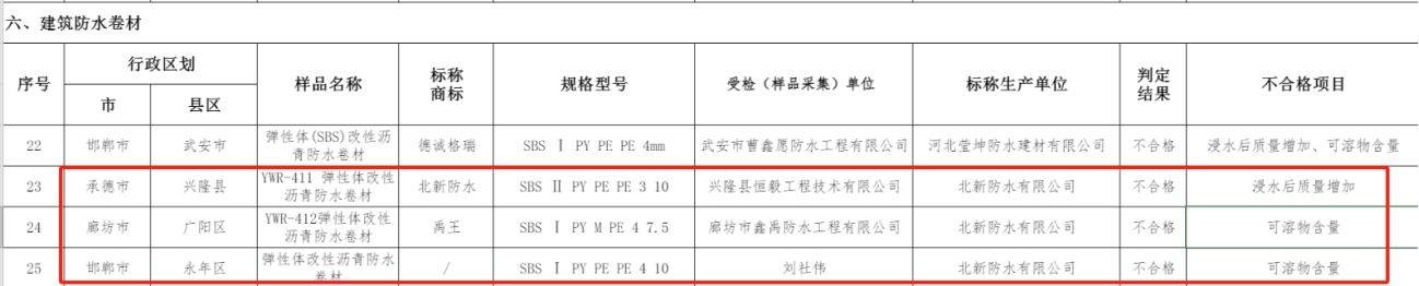 10月30日,河北省市场监督管理局发布《关于家用燃气灶等产品质量监督抽查结果的通告》,其中北新三款产品防水卷材抽检均不合格,不合格项为浸水后质量增加、可溶物含量不合格。
