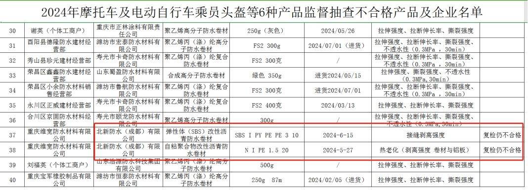 11月25日,重庆市市场监督管理局官网发布《关于2024年摩托车及电动自行车乘员头盔等 6种产品监督抽查情况的通告》显示,在防水材料的抽查中,北新防水两款产品赫然登上“黑榜”,并且属于复检仍不合格。