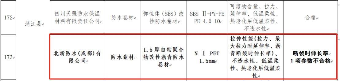 今年5月,成都市住房和城乡建设局发布的《成都市建设工程质量监督站关于2024年第一季度全市房屋建筑和市政工程进场材料抽检工作情况的通报》显示,北新防水(成都)有限公司生产的自粘聚合物改性沥青防水卷材,断裂时延伸率1项参数不合格。