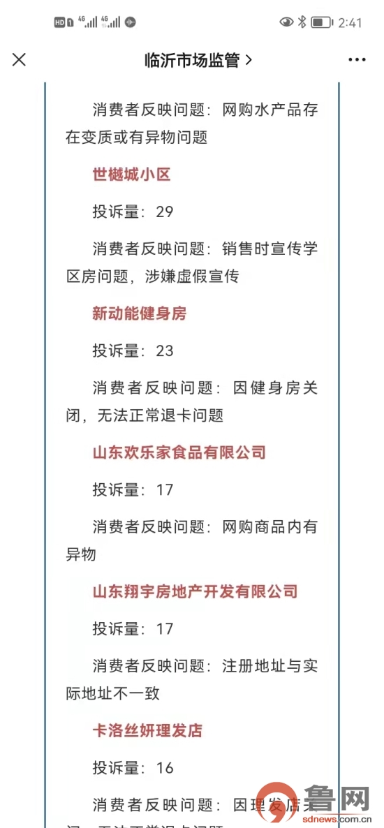 近日,临沂市场监管发布2022年1月份临沂市被投诉举报前十名企业名单,包括健身房、食品店、房地产开发公司等。其中,山东欢乐家有限公司投诉量占17个榜上有名,消费者均反映其网购商品内有异物。