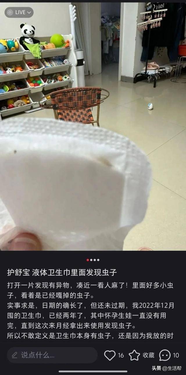近日,广东一女子在购入护舒宝液体卫生巾后,打开发现一只虫子从里面钻了出来并不停蠕动。