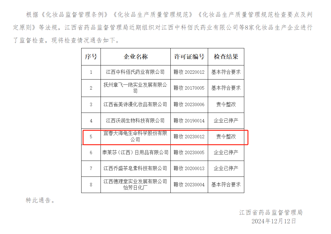 通告明确指出,在受检的8家企业中,江西省美诗漫化妆品有限公司、宜春大海龟生命科学股份有限公司(以下简称“宜春大海龟”)被要求立即进行整改。其中,宜春大海龟刚刚在10月份完成了第四期上市辅导工作。