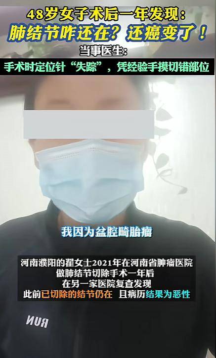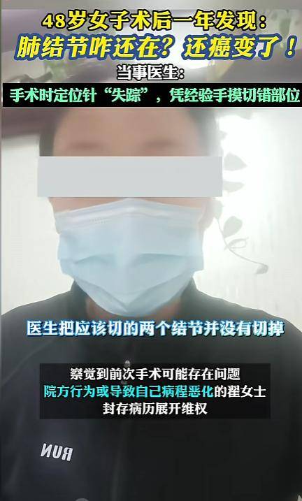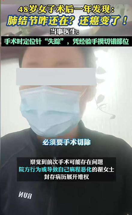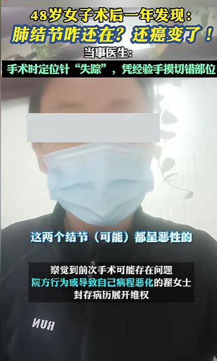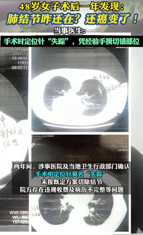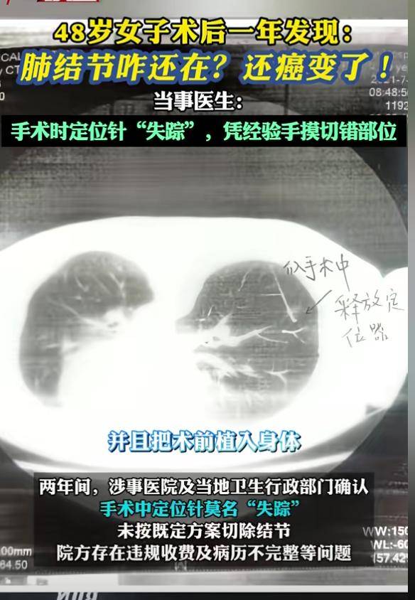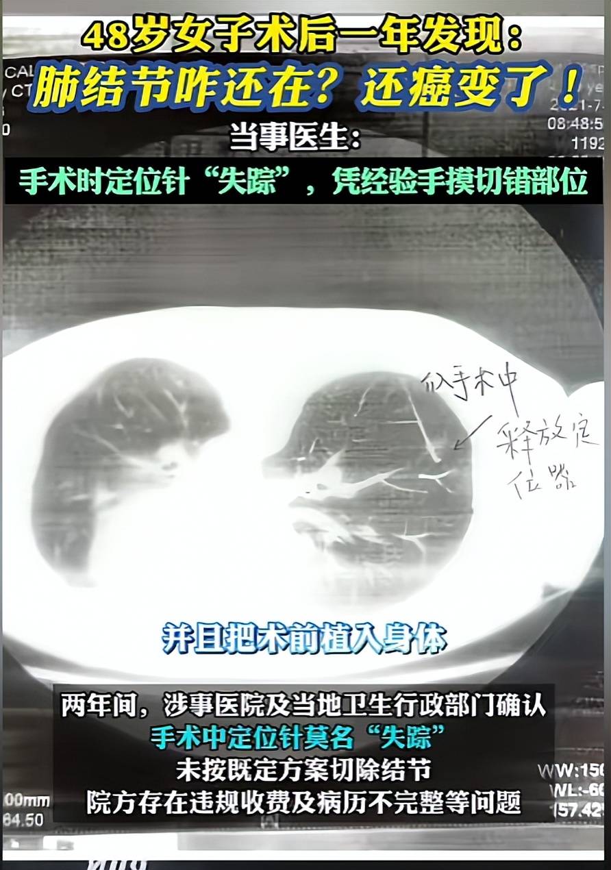 手术中用于定位的针“失踪”,医生“凭手摸”下刀,结果切错了地方,术后的检查却显示结节还在原位。一年后,这两个结节被确诊为恶性肿瘤。
