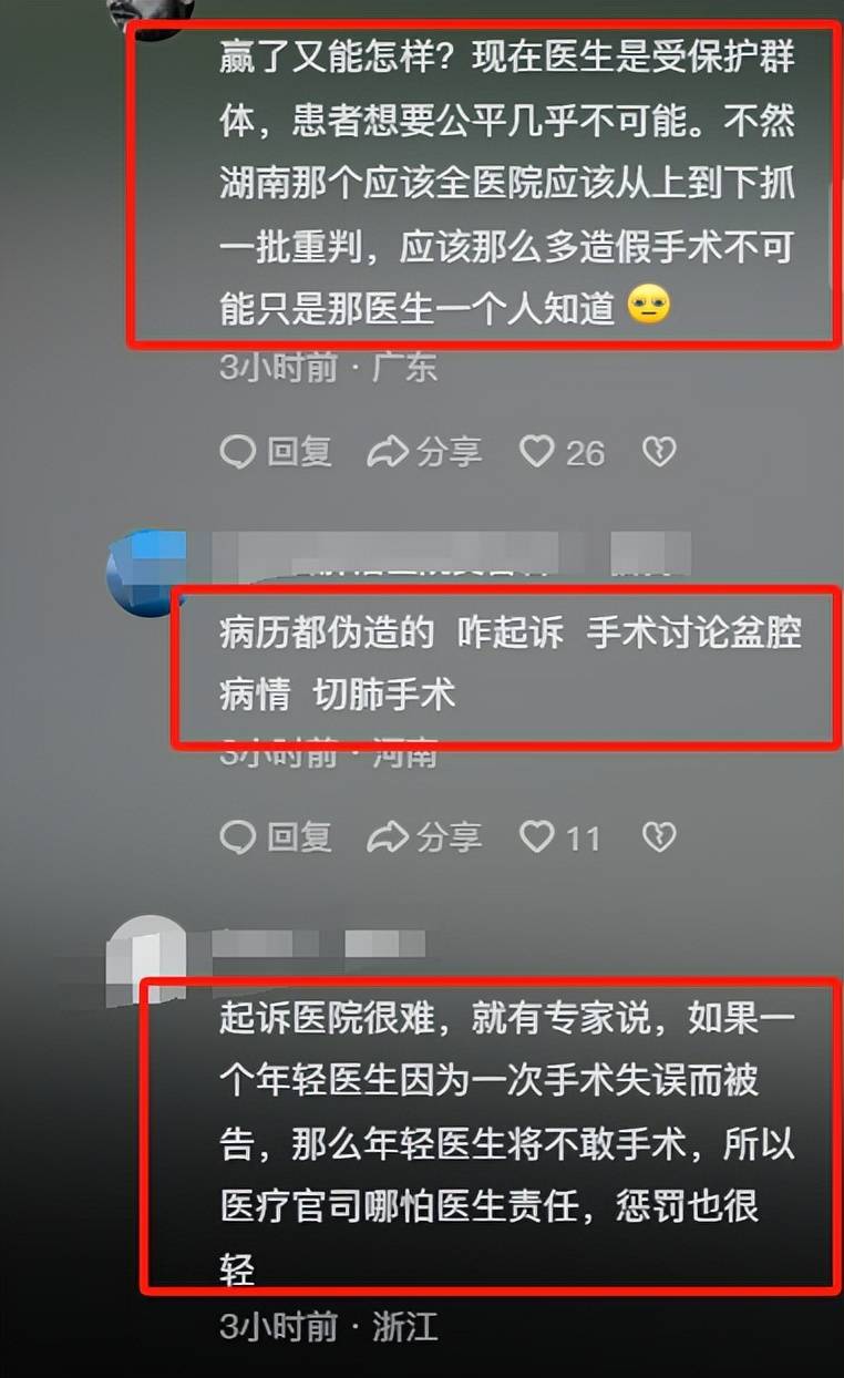 有网友表示:“起诉医院很难,就有专家说,如果一个年轻医生因为一次手术失误而被告,那么年轻医生将不敢手术,所以医疗官司哪怕医生责任,惩罚也很轻!”
