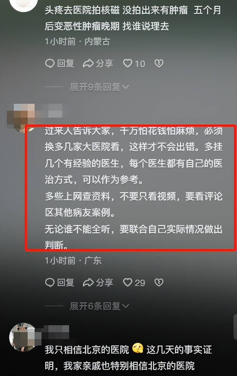 还有的网友提议道:“过来人告诉大家,千万怕花钱怕麻烦,必须换多几家大医院看,这样才不会出错。多挂几个有经验的医生,每个医生都有自己的医治方式,可以作为参考。多些上网查资料,不要只看视频,要看评论区其他病友案例。无论谁不能全听,要联合自己实际情况做出判断。”