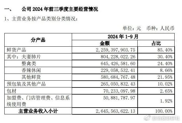 2024年前9月,紫燕食品的夫妻肺片营业收入达8.04亿元,占主营业务收入的30.4%。