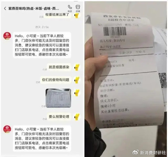 同时,有网友晒出疑似食用紫燕百味鸡产品后,细菌感染就医的就诊记录。联系官方店客服后,得到的答复也是略显局促。
