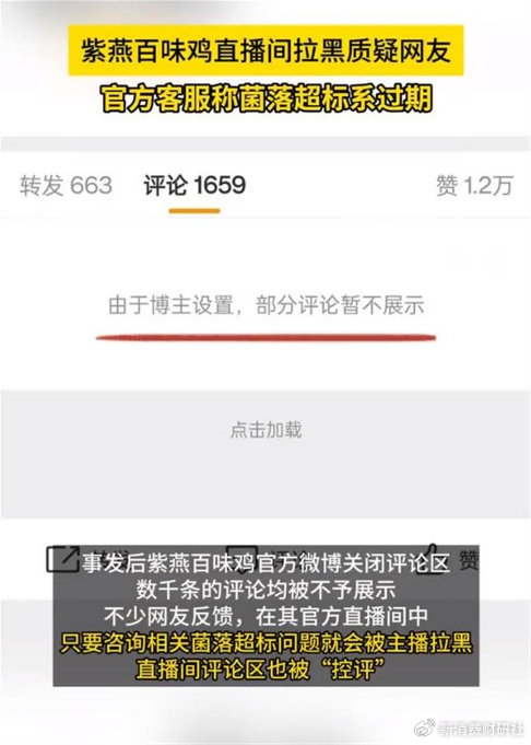 值得提到的是,事发后紫燕百味鸡官方微博关闭评论区,数千条的评论均被不予展示,不少网友反馈,在紫燕百味鸡官方直播间中只要咨询相关菌落超标问题就会被主播拉黑,直播间评论区也被“控评”。网友们纷纷表示:爱吃紫燕百味鸡的我感觉天塌了。