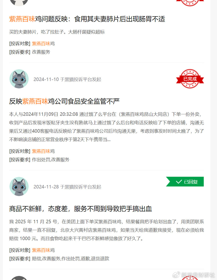 然而,这一辉煌成就的背后,却隐藏着食品安全与消费争议的阴影。据黑猫投诉平台数据显示,紫燕百味鸡已累积超过400条消费者投诉,主要反映食品中存在异物、变质等安全隐患,甚至有消费者因食用其产品后出现身体不适乃至疾病。