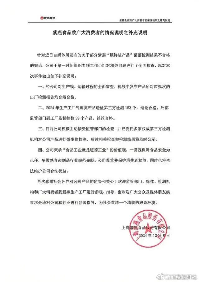 12月8日,紫燕百味鸡官方账号再发声明称:“锁鲜装产品”菌落检测结果不合格的舆论,公司于第一时间组织专项工作小组对相关问题进行了全面核查。