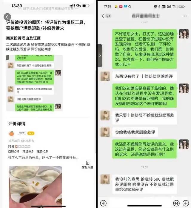令她没想到的是,喜家德涉事门店对何小姐的评价发起投诉,理由是:“(消费者)将评价作为维权工具,要挟商户满足退款/补偿等诉求”,并提供了微信聊天记录做证明。聊天记录显示,何小姐要求10倍赔偿或者赔偿500元才能删除差评。