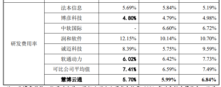 而同期同行业可比公司研发费用率的平均值分别为7.49%、6.59%和7.41%,慧博云通在研发投入上一直不及同行。