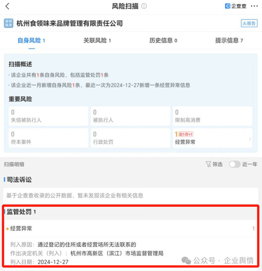 2024年12月27日,杭州食领味来品牌管理有限责任公司因通过登记的住所或者经营场所无法联系的原因被杭州市高新区(滨江)市场监督管理局列入经营异常。