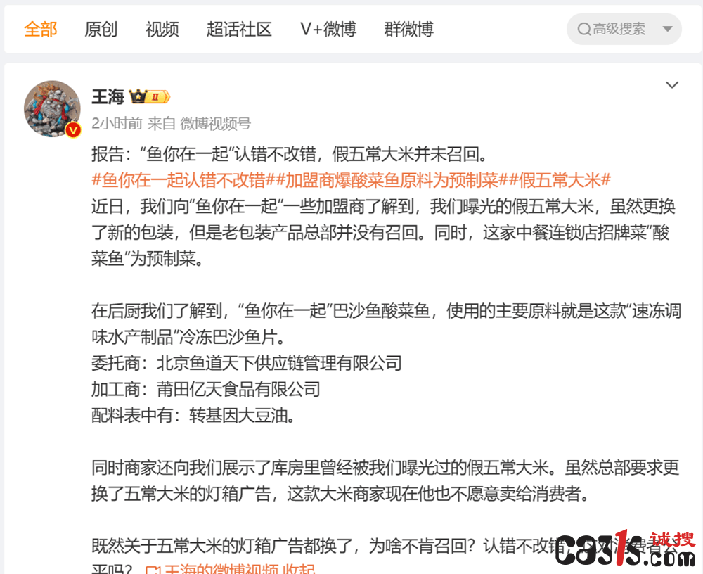 王海表示,据“鱼你在一起”加盟商透露,尽管总部要求更换五常大米的灯箱广告,但老包装产品仍在流通。此外,王海还爆料称,该店招牌菜“酸菜鱼”也是预制菜,主要原料为冷冻巴沙鱼片,委托商为北京鱼道天下供应链管理有限公司,加工商为莆田亿天食品有限公司,配料表中使用的油为转基因大豆油。