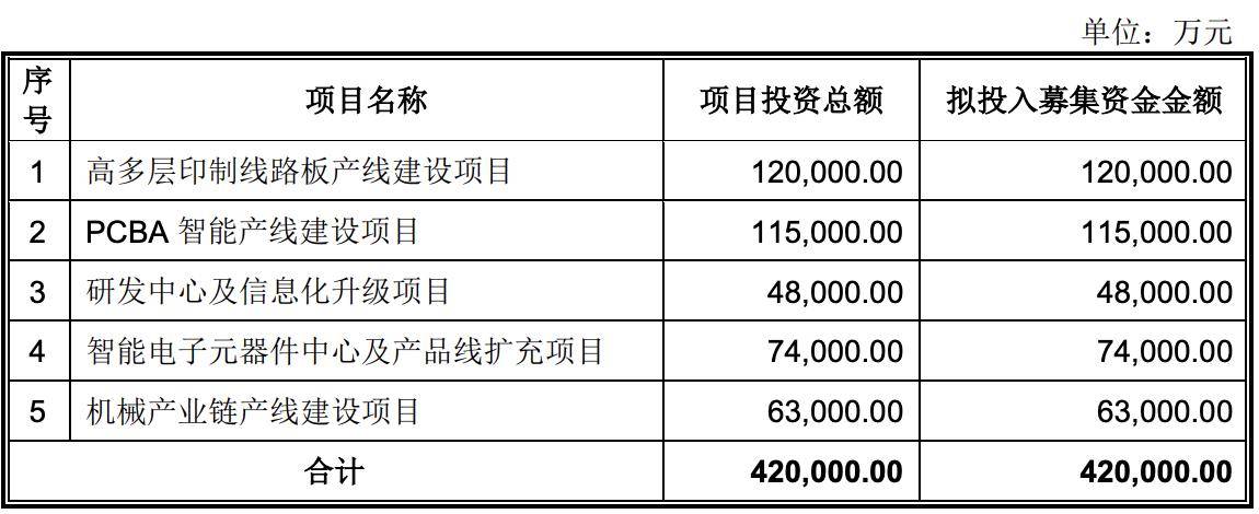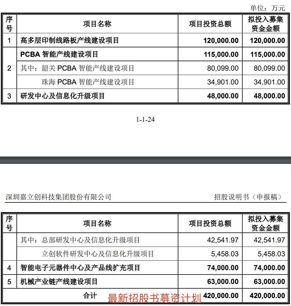 其中,“高多层印制线路板产线建设项目”拟投入12亿元,较此前(20亿元)减少8亿元。嘉立创称,该项目投产后的PCB产品层数更多、产品单价更高,故预计募投项目的单位设备投入产出比略高于公司现有的高多层PCB产线。
