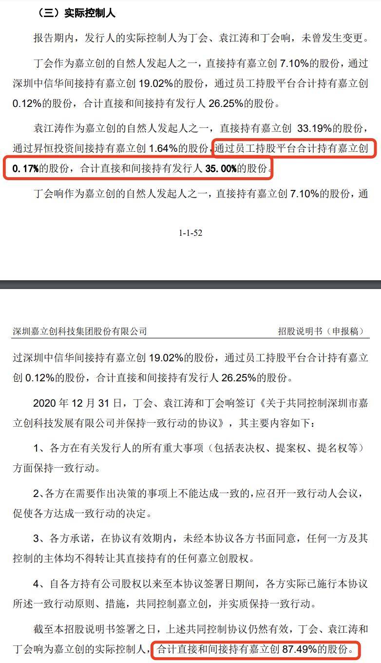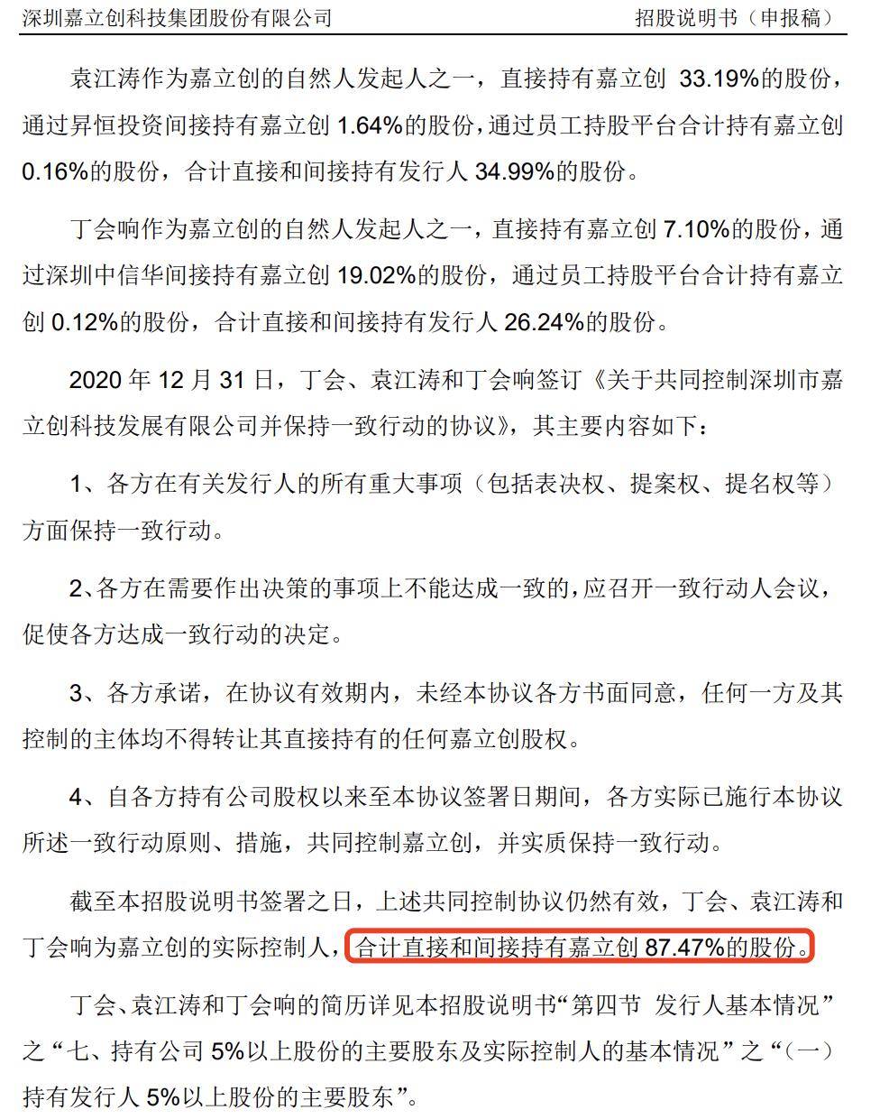 特别说明的是,嘉立创早前招股书(2023年6月和2023年12月)则显示,丁会、丁会响和袁江涛为嘉立创的实际控制人,合计直接和间接持股87.47%,2024年3月版招股书则变成87.48%,2024年6月招股书变成87.49%,2024年12月为87.49%。