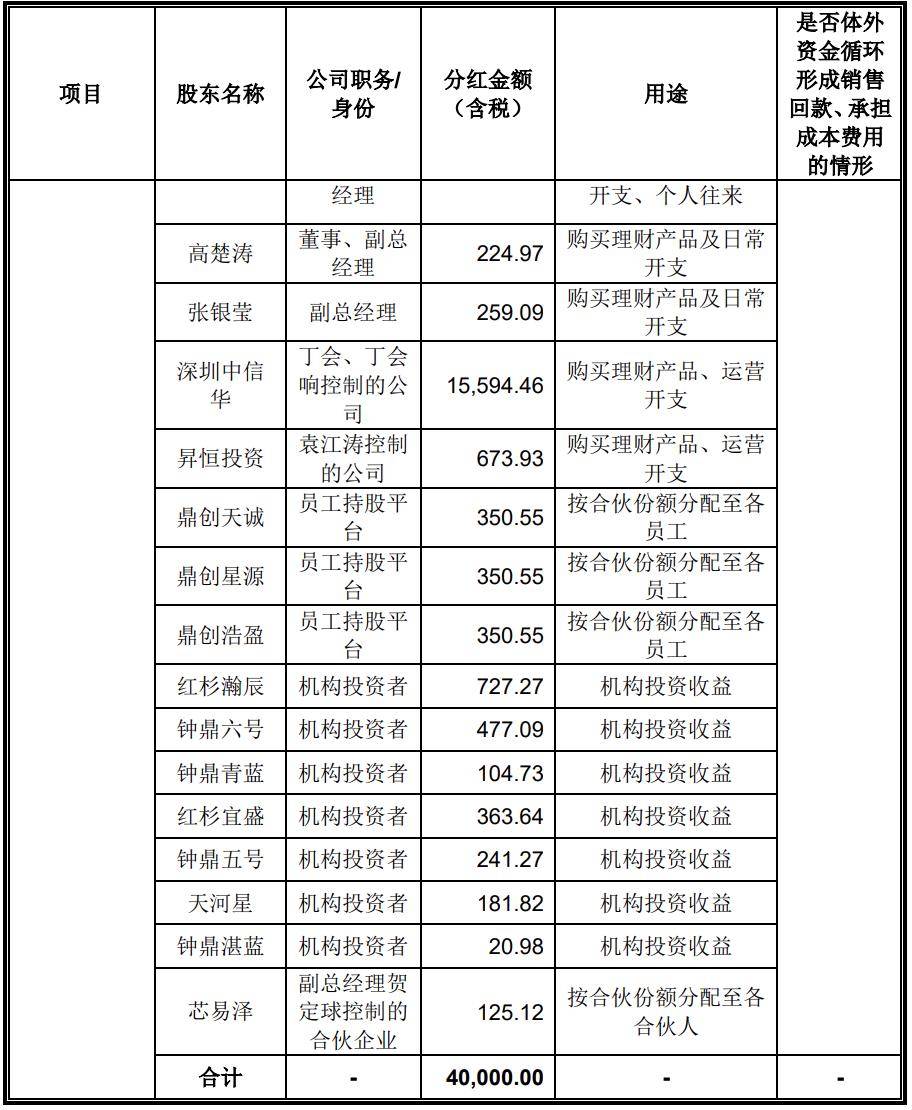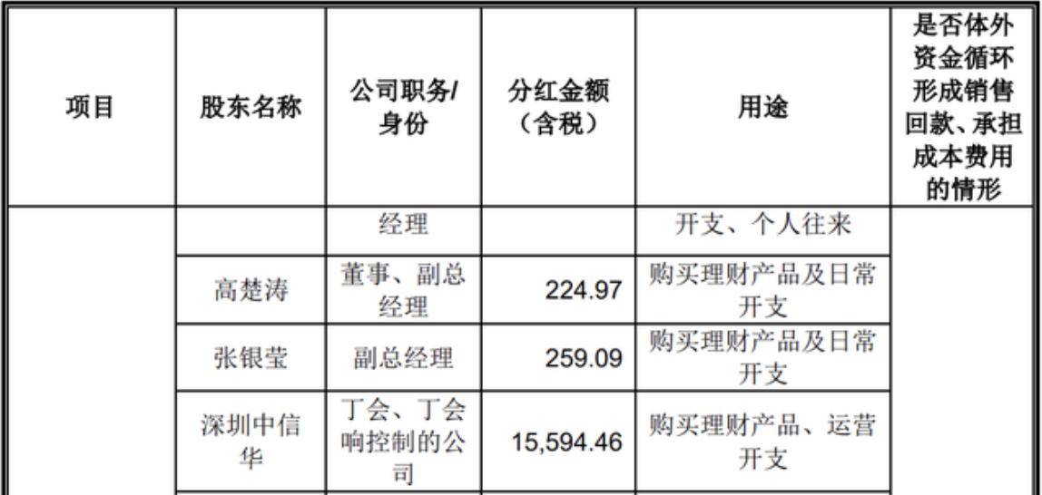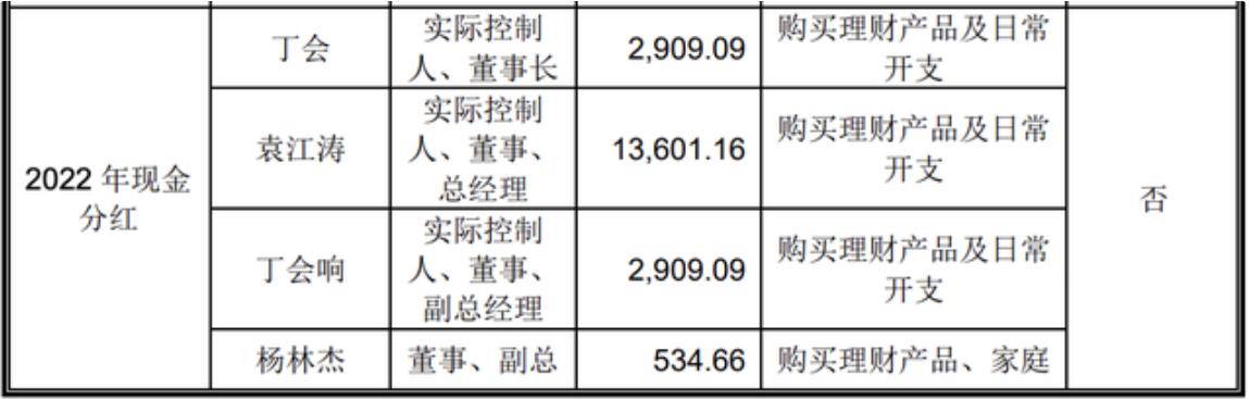 但贝多财经发现,通过嘉立创2022年的4亿元巨额分红,作为董事长的丁会获得现金分红2909.09万元,董事、总经理袁江涛获得约1.36亿元,董事、副总经理丁会响获得2909.09万元,丁会、丁会响控制的深圳中信华获得约1.56亿元。