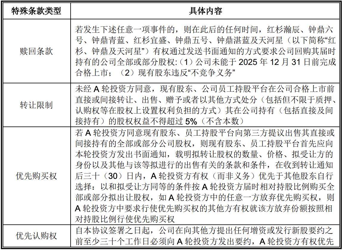 以红杉瀚辰、钟鼎六号、钟鼎青蓝(以下简称“A轮投资方”)为例,设立了赎回条款等,如:有权通过发送书面通知的方式要求公司回购其届时持有的公司全部或部分股权:(1)公司未能于2025年12月31日前完成合格上市;(2)现有股东违反“不竞争义务”。