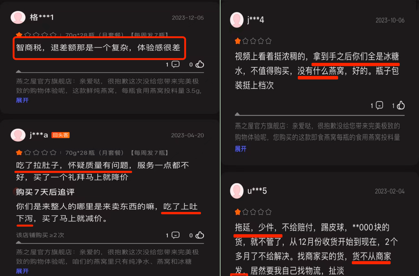 有消费者指责燕之屋的产品宣传与实际不符。他们表示,燕之屋在宣传中强调其产品的高品质和纯天然,但实际上,部分消费者在使用过程中却发现产品存在异味、杂质等问题,这与燕之屋的宣传不符。也有消费者反映燕之屋产品的口感质量不稳定。他们表示不同批次的产品口感存在差异,有的批次产品甚至存在明显的异味,严重影响了使用体验。