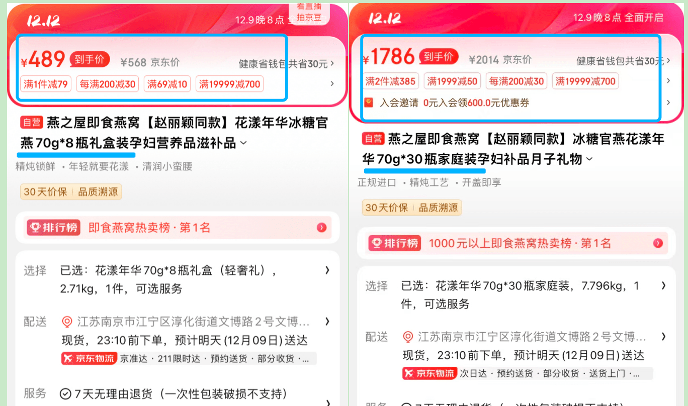 燕窝产品是否对人体有营养作用无法定论,但可以确定的是,燕窝相关产品的价格确实昂贵。根据燕之窝京东官方旗舰店显示,(赵丽颖同款)即食冰糖官燕70克8瓶装售价达到了568元,双十二活动优惠后也要489元。而70克30瓶家庭装售价达到2014元,优惠完后价格也高达1786元。