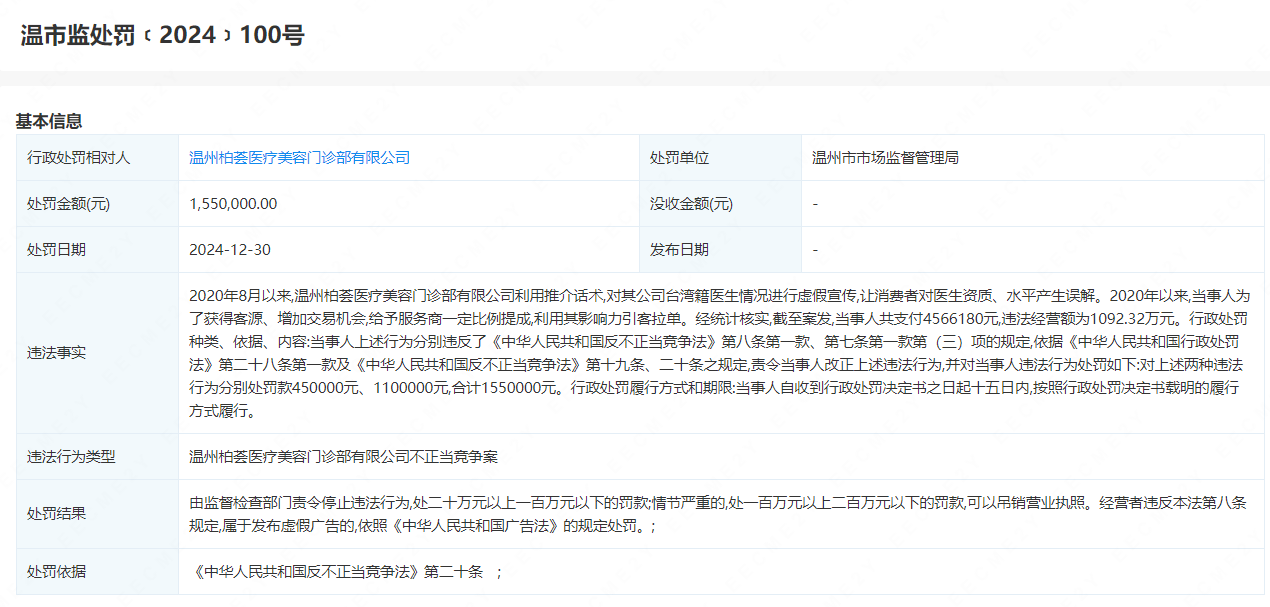 同时,温州市市场监督管理局发现2020年8月以来,温州柏荟医疗美容门诊部有限公司利用推介话术,对其公司台湾籍医生情况进行虚假宣传,让消费者对医生资质、水平产生误解。2020年以来,当事人为了获得客源、增加交易机会,给予服务商一定比例提成,利用其影响力引客拉单。经统计核实,截至案发,当事人共支付456.62万元,违法经营额为1092.32万元。因此,上述2种行为,分别被温州市市场监督管理局罚款45万元和110万元,合计罚款155万元。