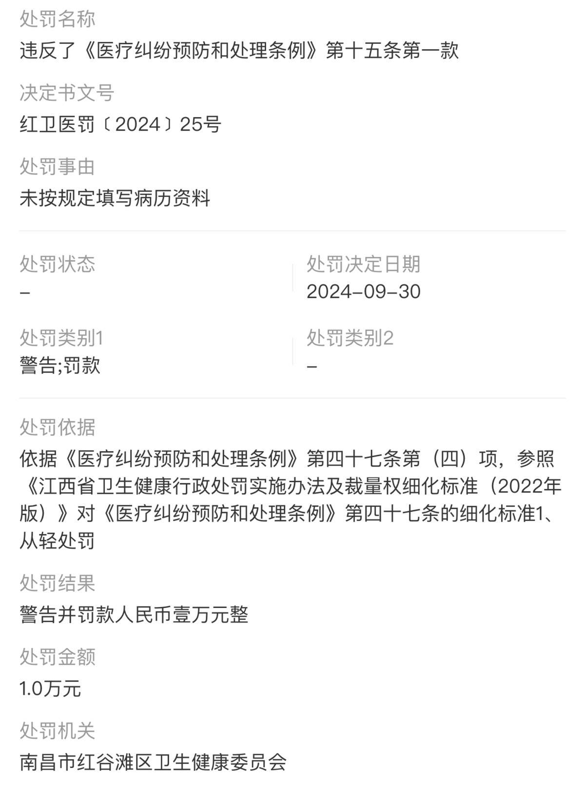2024年9月30日,江西简一国际医疗管理有限公司因未按规定填写病历资料被南昌市红谷滩区卫生健康委员会依据《医疗纠纷预防和处理条例》第四十七条第(四)项,参照《江西省卫生健康行政处罚实施办法及裁量权细化标准(2022年版)》对《医疗纠纷预防和处理条例》第四十七条的细化标准进行从轻处罚,警告并罚款人民币1万元整。