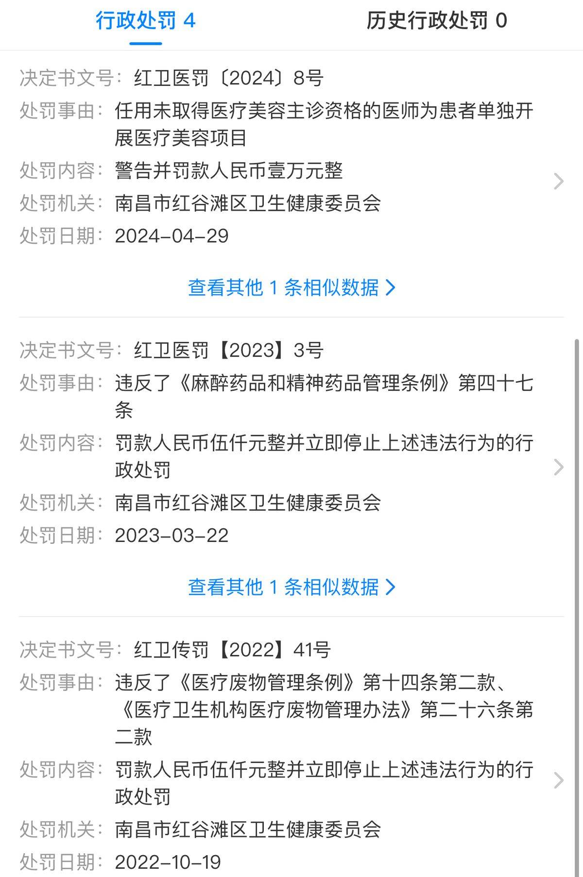 天眼查显示,江西简一国际医疗管理有限公司曾受到过多起行政处罚,总罚款金额为3万元。