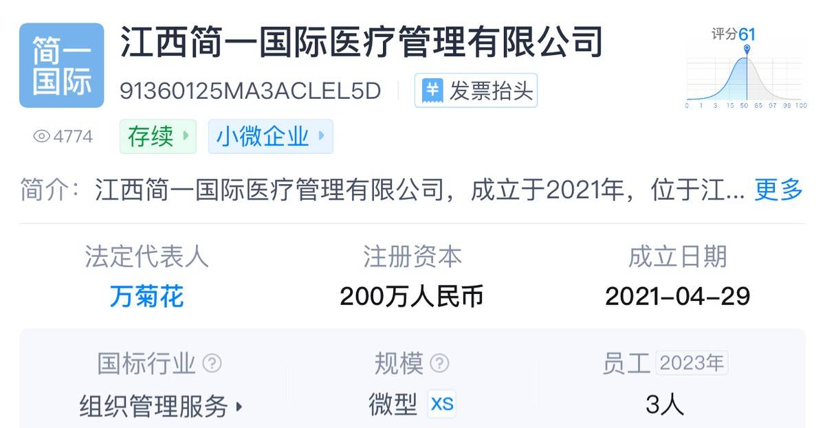 江西红谷滩简一国际医疗,成立于2021年,位于江西省南昌市红谷滩闽江路,企业注册资本200万人民币,法定代表人为万某某。