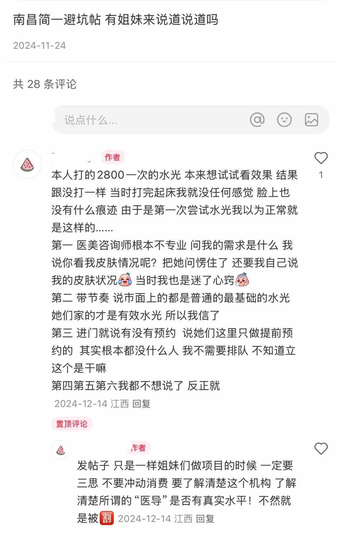 据该网友描述,该网友曾在南昌简一体验了一次价值2800元的水光针治疗,期待能看到明显效果。然而,治疗后她发现脸上没有任何变化,打了和没打没区别,因为这是她第一次尝试水光针,所以最初她以为这是正常的反应。