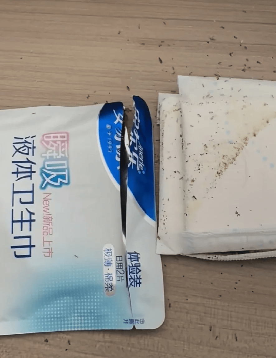 1月13日,小红书用户“张佳佳”发帖称,其买了六十包两片的安尔乐液体卫生巾,拆开发现里面有蚂蚁和虫卵,六十包里面有三包是存在明显质量问题。