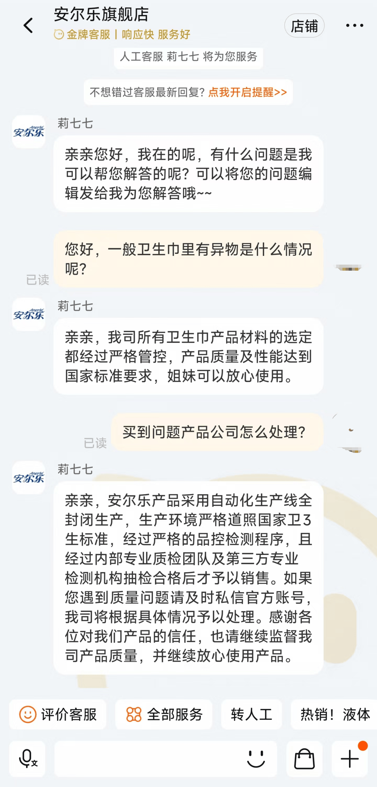 就产品质量问题,安尔乐客服回复新识研究所,“我司所有卫生巾产品材料的选定都经过严格管控,产品质量及性能达到国家标准要求,如果您遇到质量问题请及时私信官方账号我司将根据具体情况予以处理。”