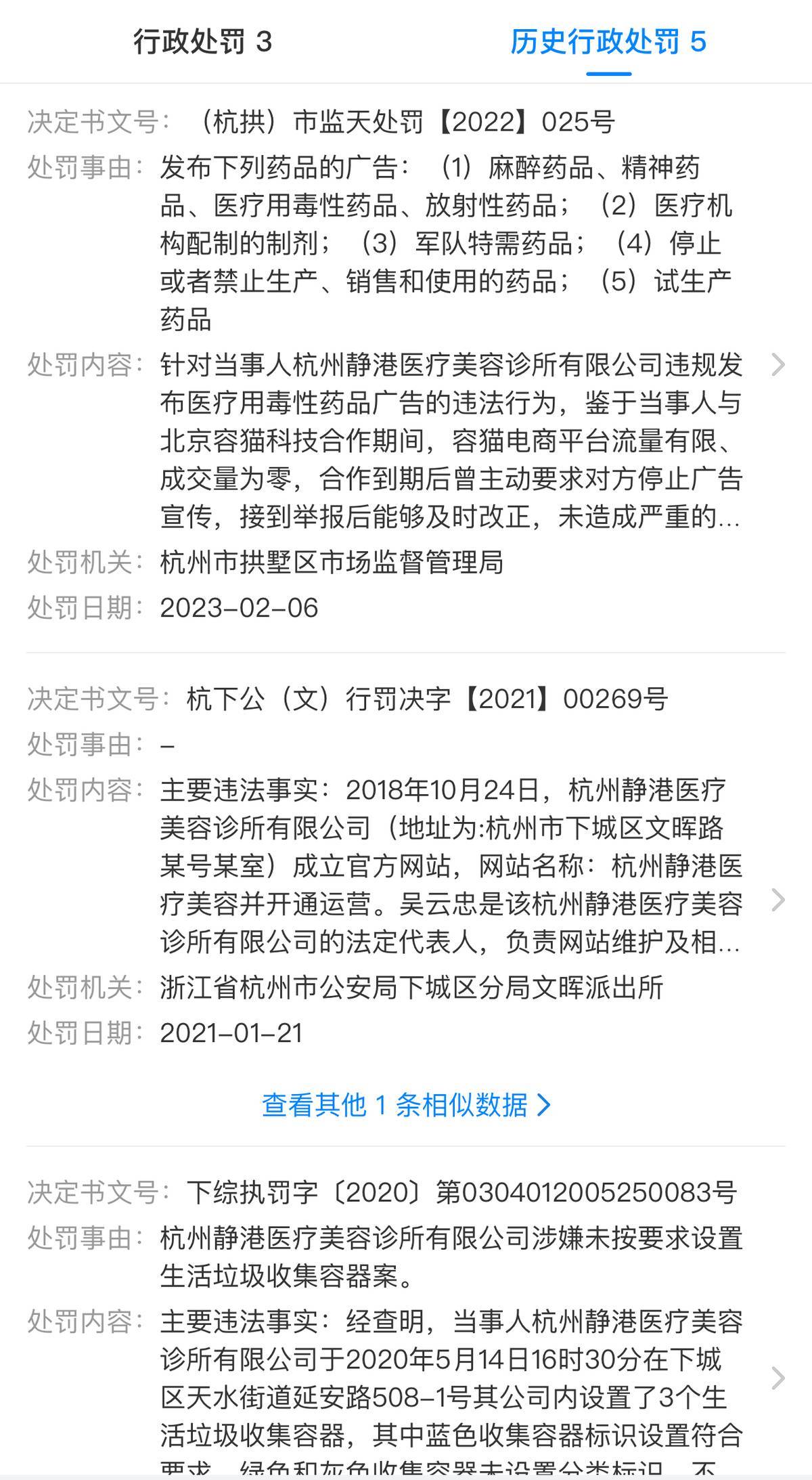 2023年2月6日,杭州静港医疗美容诊所有限公司因发布了(1)麻醉药品、精神药品、医疗用毒性药品、放射性药品;(2)医疗机构配制的制剂;(3)军队特需药品;(4)停止或者禁止生产、销售和使用的药品;(5)试生产药品等一系列药品的广告。被杭州市拱墅区市场监督管理局处以警告及罚款4800元的行政处罚。